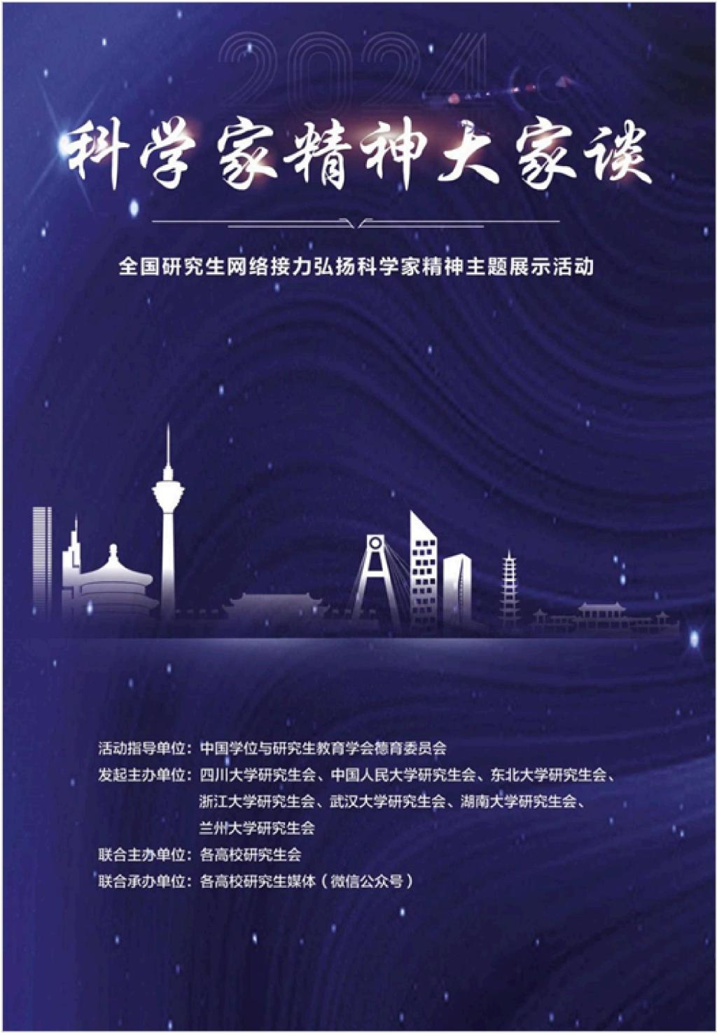 据悉,“科学家精神大家谈”全国研究生网络接力弘扬科学家精神主题展示活动在中国学位与研究生教育学会德育工作委员会指导下,由四川大学、中国人民大学、浙江大学等七所高校研究生会发起,联合全国百所高校研究生会共同主办。活动旨在传承红色基因、学思践悟中国共产党人精神谱系,大力弘扬以爱国、创新、求实、奉献、协同、育人为核心的科学家精神,激励广大研究生在践行社会主义核心价值观中走在前列、勇当先锋。