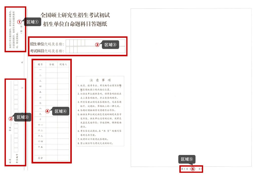 3.图一中“区域②”填写报考专业、姓名、考生编号(15位),每张答题纸均要求填写,如考生在此区域以外的地方书写个人信息,一律按违纪处理;“区域③”为招生单位和考试科目信息。上述信息须与《准考证》一致。